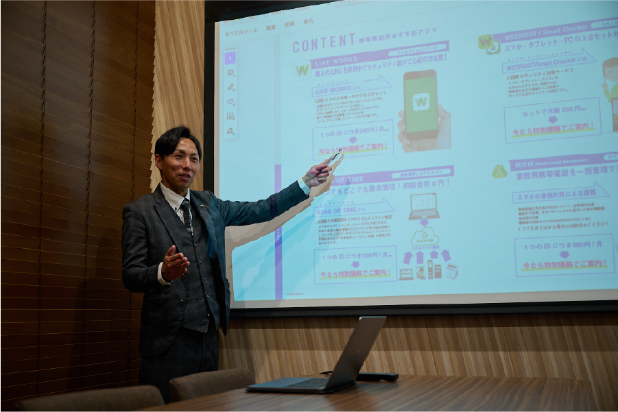 企業をサポート。 - 法人のお客様を対象に、最適な業務端末の販売を行なったり、定期的なプランの見直しなどをご提案。また、故障した機種の修理代行なども行っています。さらにモバイル以外の事業展開として、光回線を利用した超高速インターネット接続サービスなどもご提案。今後ますます通信やデジタルが進化し、企業のニーズも多様化することを踏まえて、JNGではそのための人材育成と採用にも力を入れています。